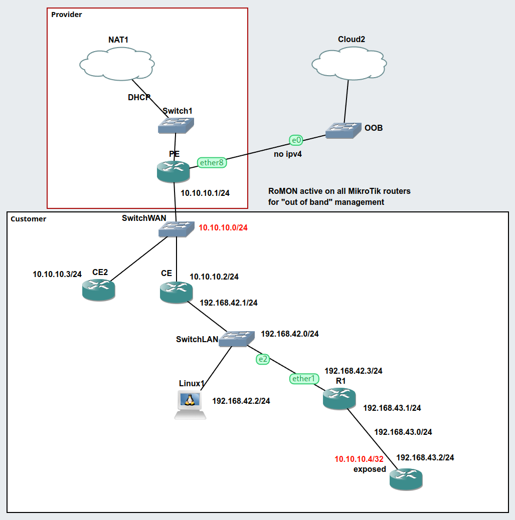 The following picture shows the simulated infrastructure. The IP 10.10.10.4 actually lives behind an internal router, but still is reachable by the provider’s equipment.